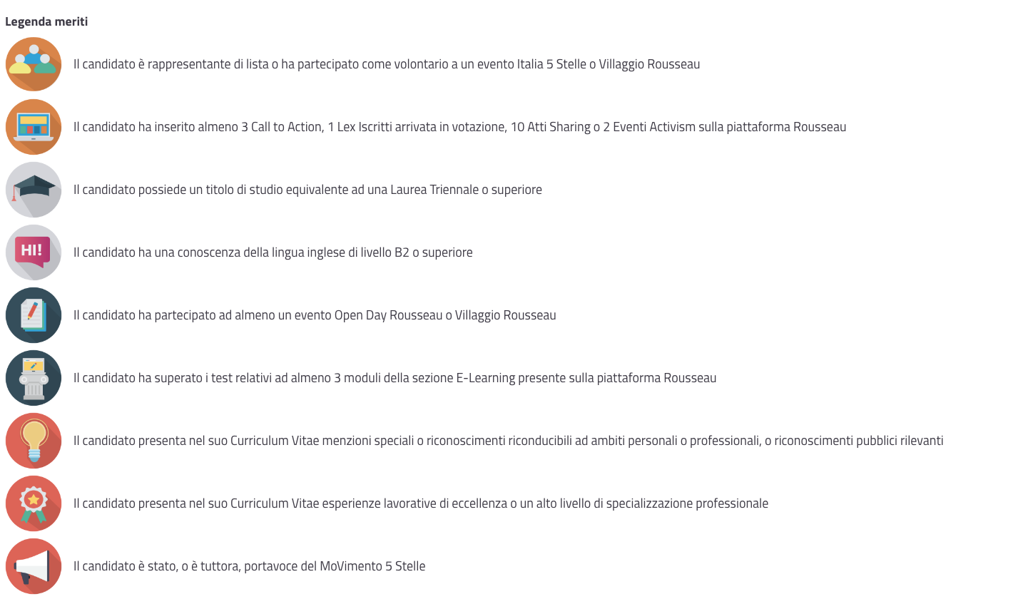 Grazie al nuovo sistema dei meriti puoi ordinare i profili dei candidati sulla base di diversi fattori, in parte legati al curriculum e alla conoscenza delle lingue, ma anche alle attività svolte per il MoVimento e su Rousseau. I meriti sono visibili sui profili dei candidati e ne determinano l’ordine di elenco”.